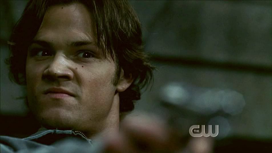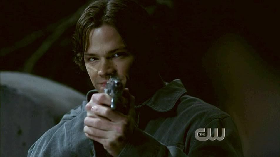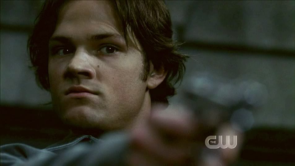 Sam reluctantly puts down his own gun, only to pick it up again and aim it squarely at Jake as he uses the Colt to open the Devil's Gate. *shudders* Darkside!Sammy staring down the barrel.
