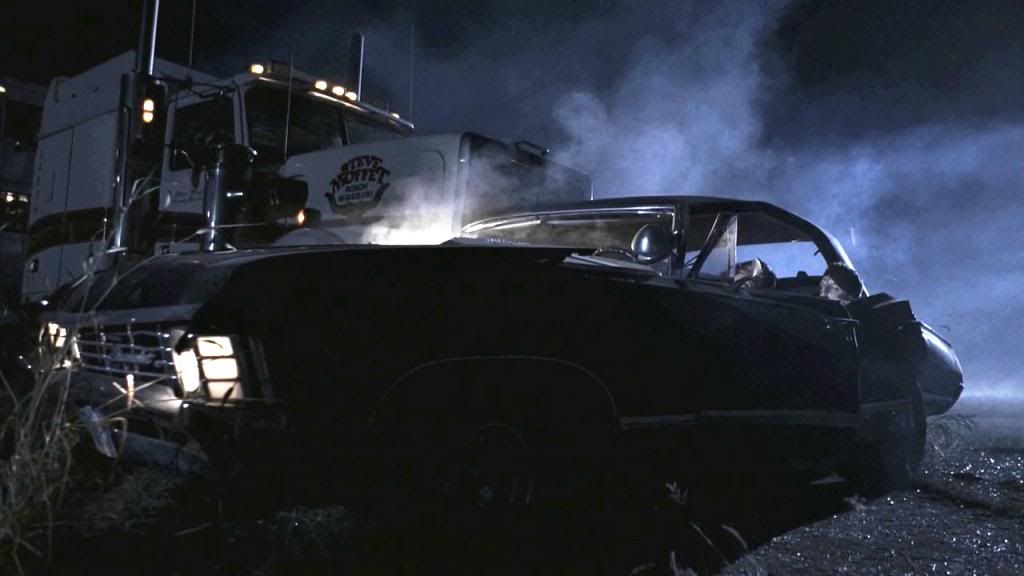 Thought we'd do another cap lottery with one of my favorite episodes and I didn't want to miss Impala Sunday, so here's our poor Baby all busted up with our dear Winchesters equally broken inside. Meep. :(