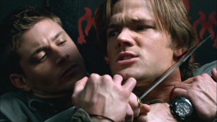 Intense scene as Dean is being controlled by the Siren and holding Sam at knife point.