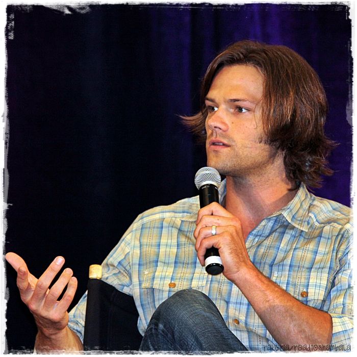 Jared answering a fan's question. I like how he's turned toward the person he's talking to, giving them his full attention. Jensen does this as well, of course and but yet they both make sure to speak out to the crowd often. They make sure everyone is included and not ignored. :)
