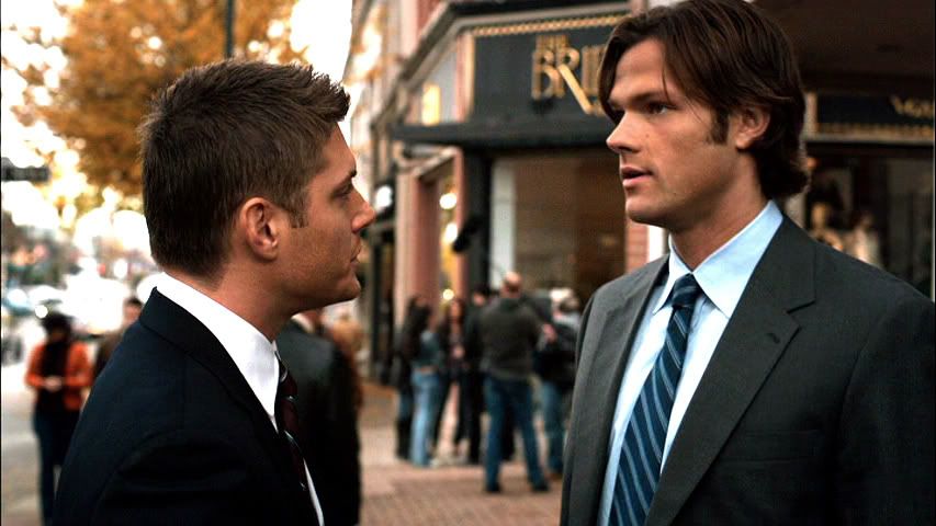Looks like Sam's about to give a classic eye-roll here. Sort of how I feel about last night's episode. Meanwhile I'll be over here drooling over Dean's profile and hair. *g*
