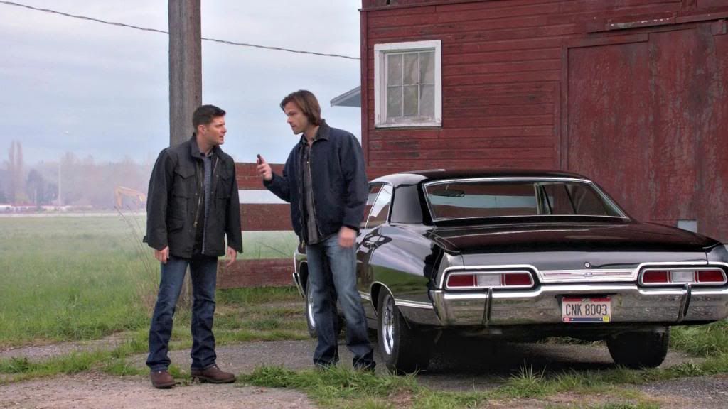 The boys taking a call from Crowley out by the Impala.