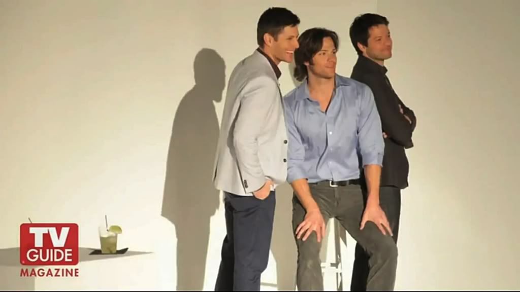Jensen, Jared, and Misha posing for photos for the TV Guide Fan Favorite issue.