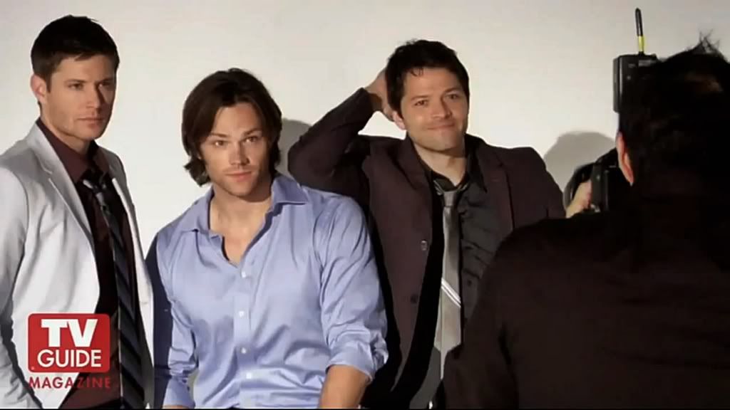 Jensen, Jared, and Misha posing for photos for the TV Guide Fan Favorite issue.