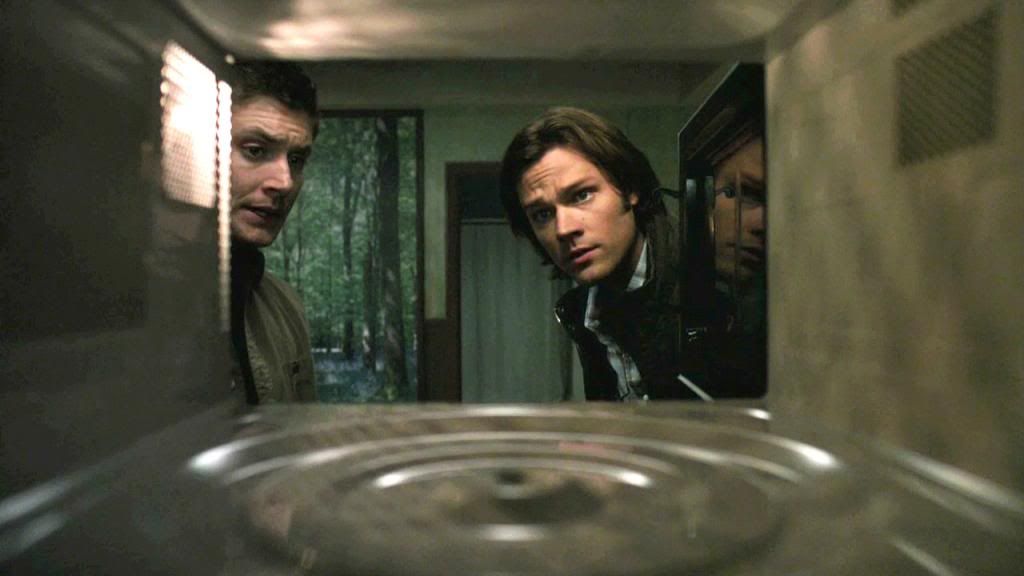 Today's cap is from the Awesome Angles Theme. Love it when they shoot from inside a fridge or in this case, a microwave to see the actor's faces. Here, soulless Sam doesn't see the fairy "blech" that Dean does.