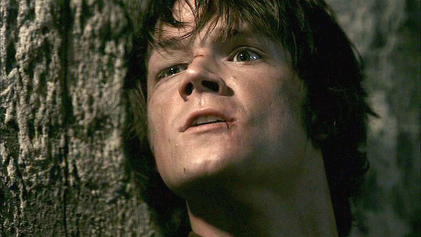 Sam with a swollen eye and beat up face as the YED torments Dean.