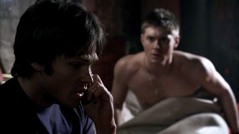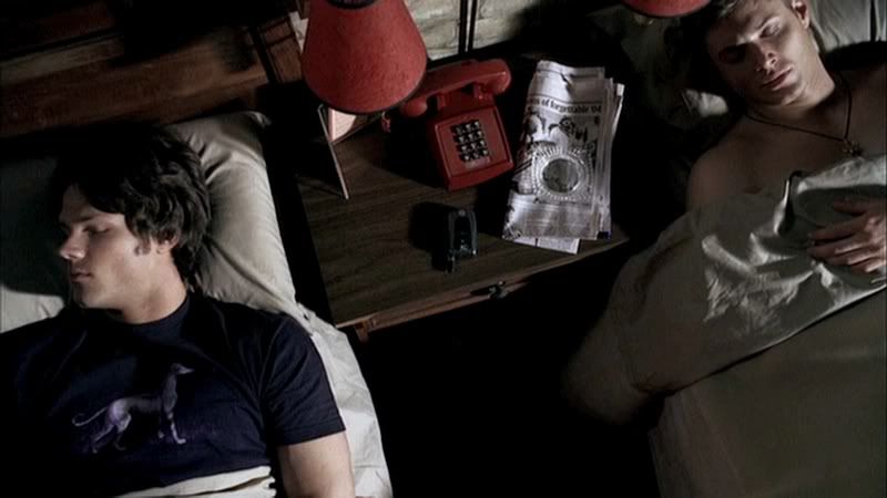 Ah, a beautiful shot of our sleeping boys. They look so peaceful. Now if only Sam was sleeping without a shirt on, too. Mmmmmmmm....Jensen.