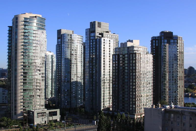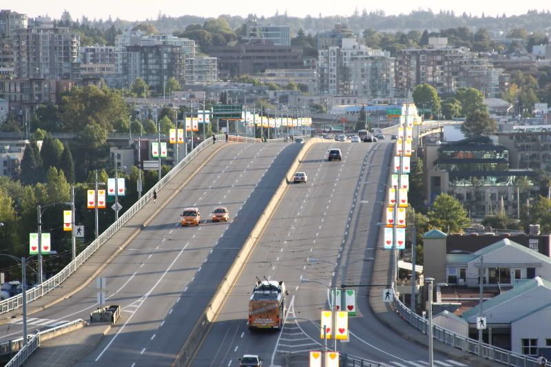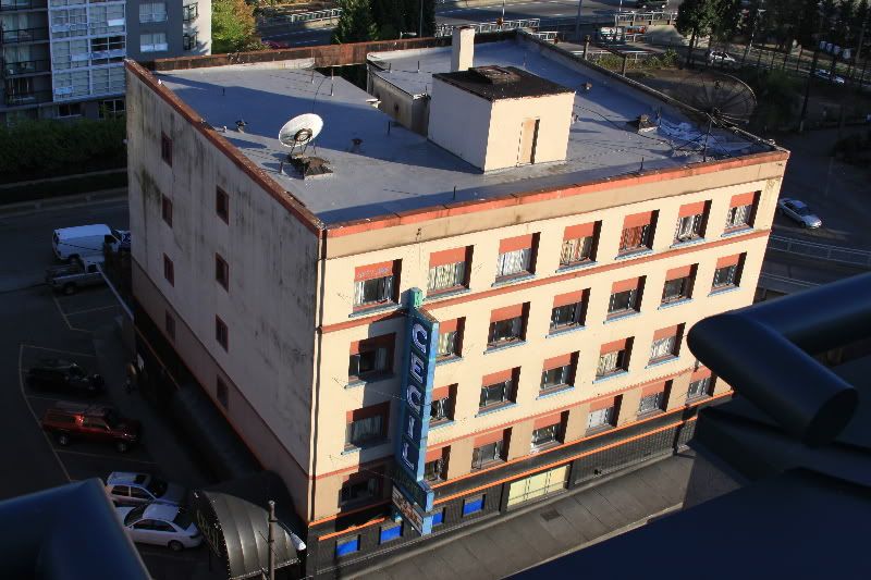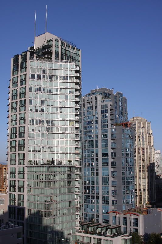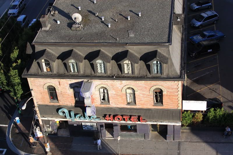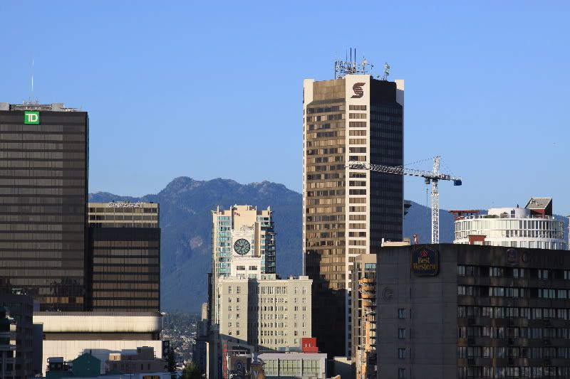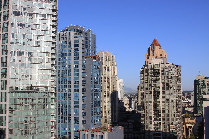 We got to the hotel (Best Western Downtown on Drake St.) and had some problems trying to figure out where to park the car because a big group of bikers were also just checking in. But it all worked out in the end, we got to our room (which is clean & very nice!), and I worked on getting all our stuff up to the room. Ugh. We settled in, watched a little TV, and enjoyed the lovely view of Granville Bridge from our 7th story room. After a bit, I went up to their rooftop area to check out the view.