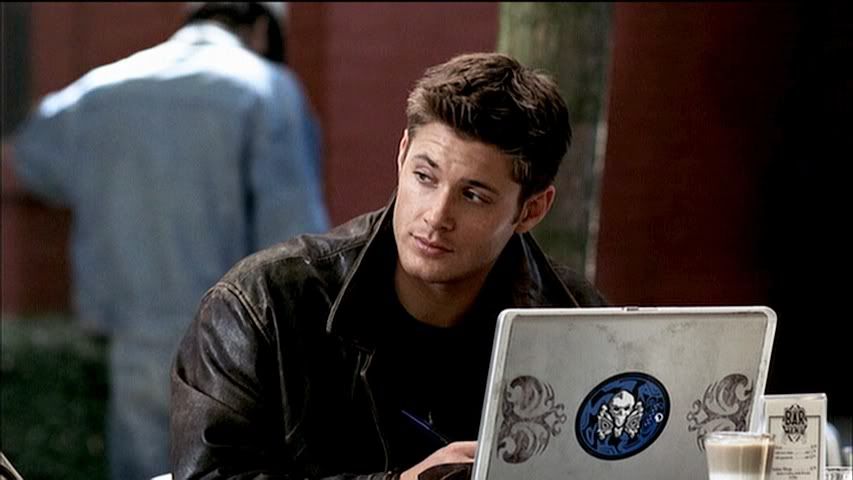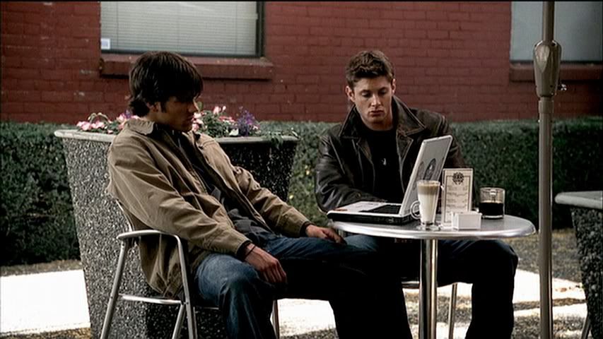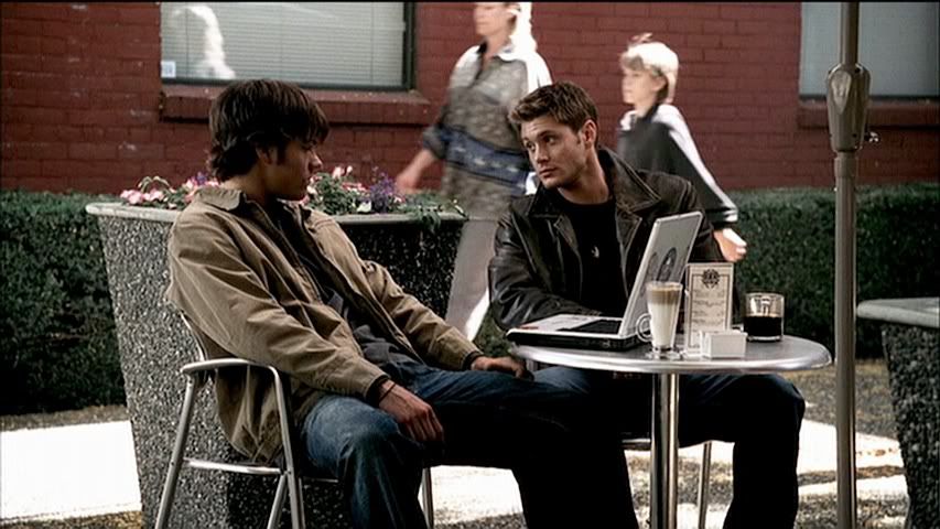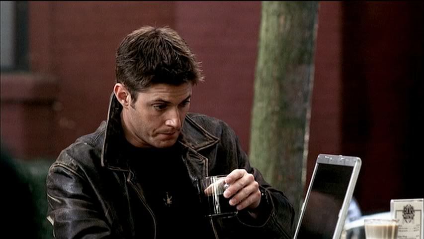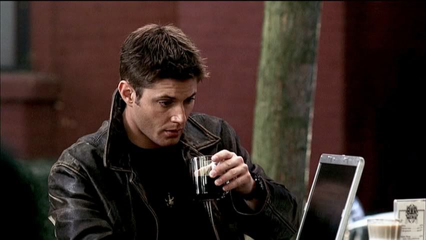 *guh* Now it's Dean's turn. Looking all super sexy with his collar turned up on that cool leather jacket. And enjoying his daily caffeine intake.