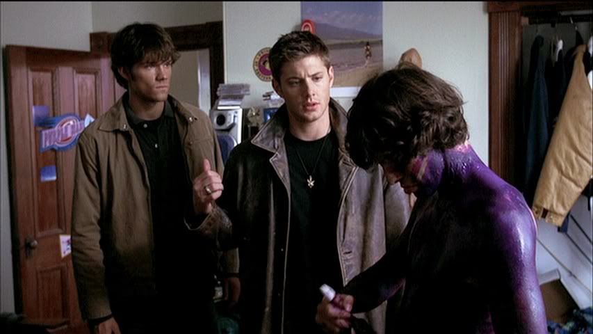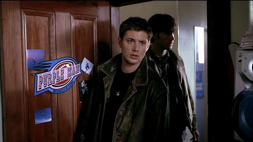 Love the trademark, Dean Winchester grin in the second cap. More "brother" shots as the boys enter Purple Man's room.