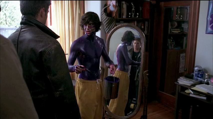 Just had to include the arched eyebrow in the second cap. This show does love to use mirrors. You can see Dean's reflection in the one shown in the third cap. Dean quickly passes off the painting duties to Sam..."He’s the artist. Things he can do with a brush."